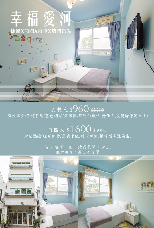 只要960元起,即可享有【高雄-幸福愛河】捷運X商圈X夜市X熱門景點~住宿專案〈含A.雙人房(黃姑織女/青梅竹馬/藍色珊瑚/紫羅蘭/綠野仙蹤/紅粉佳人) / B.四人房(粉紅駭綠/綠草如茵/萬紫千紅/藍天碧海) 住宿一晚(視現場房況為主) + 液晶電視 + WIFI〉麻吉獨享:週五不加價